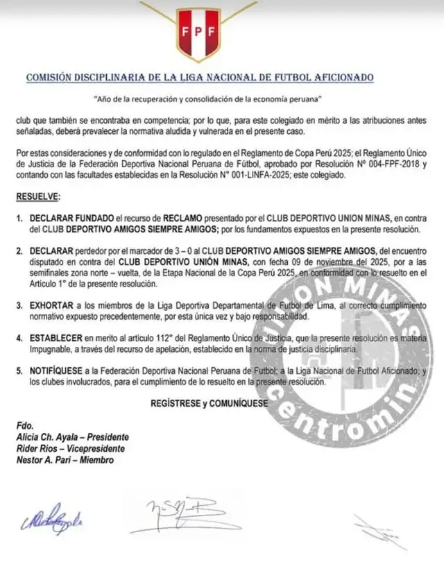 Unión Minas había perdido en penales ante Club Amigos Siempre Amigos (ASA FC) en la final de la Zona Norte; sin embargo, el cuadro de Cerro de Pasco elevó un reclamo por mala inscripción de dos jugadores de su rival y el mismo fue declarado fundado por la Comisión Disciplinaria de la FPF.