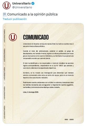Universitario de Deportes no ignoró el grave incidente posterior al encuentro contra Alianza Atlético. En la noche del domingo 11 de mayo, el club publicó un comunicado en el que expresó su rechazo absoluto hacia las agresiones que sus jugadores y familiares recibieron en una de las tribunas del Estadio Monumental.