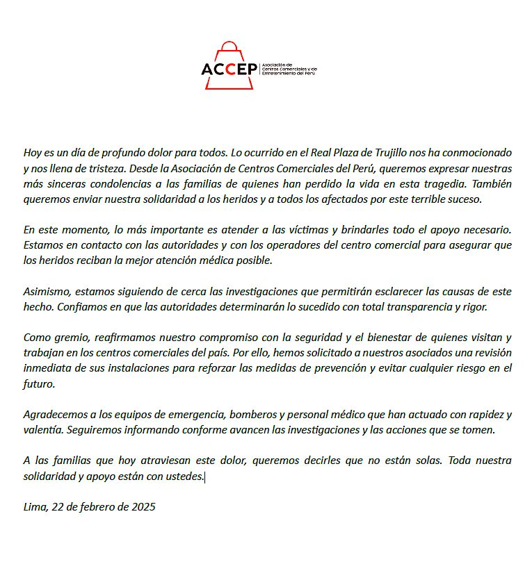 La Asociación de Centros Comerciales del Perú (ACCP) se pronunció públicamente tras la tragedia ocurrida en Trujillo, donde el colapso del techo del centro comercial Real Plaza dejó al menos cuatro personas muertas y más de 70 heridas. En un comunicado, el gremio expresó sus condolencias a las familias de las víctimas y su solidaridad con los heridos y afectados por este lamentable suceso.