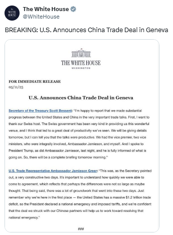 En ese contexto, la Casa Blanca emitió en comunicado, en donde informan el «humo blanco» alcanzado por ambas naciones. El secretario del Tesoro de EE. UU., Scott Bessent, señaló que las «conversaciones fueron productivas», y al mismo tiempo, informó que ha mantenido comunicación inmediata con Donald Trump sobre los acuerdos que se darán a conocer recién en unas horas.