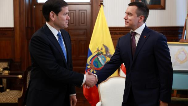 Tras su viaje a México, el secretario de Estado de Estados Unidos, Marco Rubio, se reunió en Quito con el presidente Daniel Noboa y otras autoridades, con los asuntos de seguridad como parte central de la agenda. En medio de su visita, el Departamento de Estado, dirigido por Rubio, designó a los grupos ecuatorianos ‘Los Choneros’ y ‘Los Lobos’ como organizaciones terroristas. Además, anunció 13,5 millones de dólares para combatir el narcotráfico.
