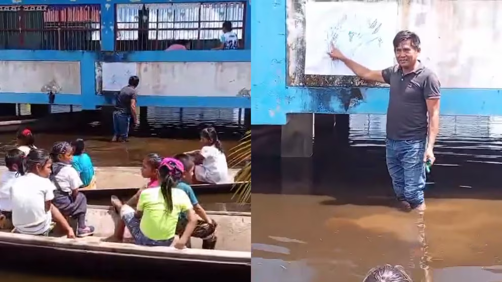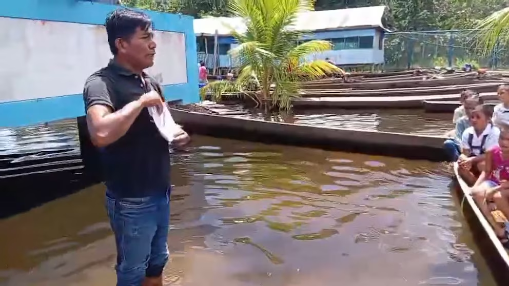 En imágenes captadas por los padres de familia y difundidas por redes sociales, se observa a los niños siguiendo sus lecciones bajo el sol, sentados en embarcaciones que flotan cerca al colegio anegado. En tanto, el docente identificado como Segundo Curitima Manihuari se mantiene de pie dentro del agua y dicta la clase utilizando una pared como pizarra improvisada. La sesión es en lengua kukama, propia de esta comunidad originaria.