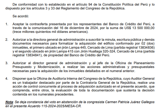 «Aceptar la contraoferta presentada por los representantes del Banco de Crédito del Perú, a través de la comunicación del 16 de diciembre de 2024, por la suma de US$ 13.500.000 (trece millones quinientos mil dólares americanos). Autorizar a la directora general de administración a suscribir la minuta, escritura pública y demás documentos necesarios para formalizar la adquisición del edificio conformado por 2 inmuebles, el primero ubicado en jirón Lampa 445, Cercado de Lima y el segundo ubicado en jirón Lampa 415 con Jirón Huallaga 320-324, de propiedad del Banco de Crédito del Perú», se lee en el documento.