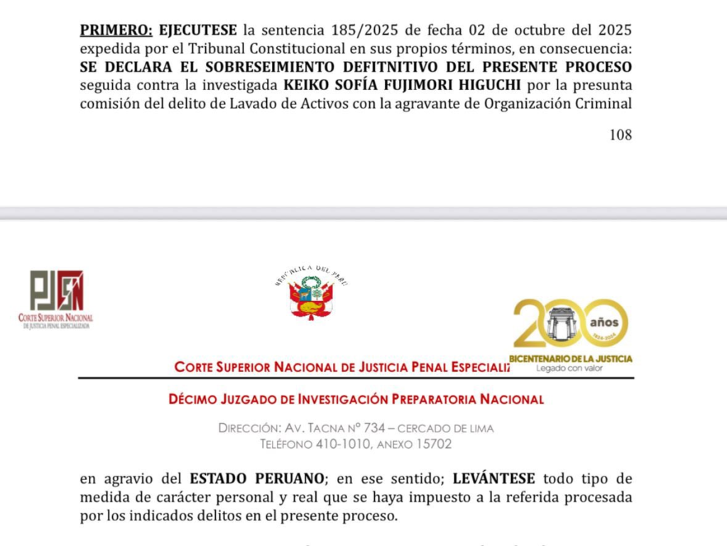 Ello, al ejecutar la sentencia del Tribunal Constitucional, de octubre de 2025, que ordenó dejar sin efecto la investigación y acusación de Domingo Pérez contra Fujimori y otros, al determinar que los hechos imputados no estaban penalizados en 2011 y antes de noviembre del 2016, y que no se probó que el partido naranja tenga finalidades delictivas.