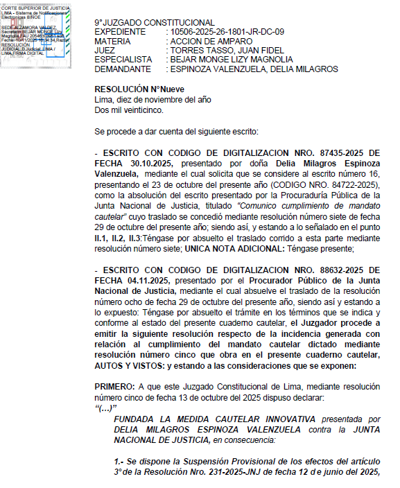 @JNJPeru incumplió su mandato cautelar, dispone suspender la medida que la JNJ dictó en contra de la Dra. Delia Espinoza mediante Resolución 143-2025-JNJ, con la cual dicha entidad, el pasado 19 de septiembre, la suspendió en su cargo de Fiscal Suprema y Fiscal de la Nación. Si bien el 9no Juzgado Constitucional dispone que la JNJ reponga a la Dra Espinoza en su condición de Fiscal de la Nación, tal mandato es inoficioso (pediremos aclaración), porque al suspender judicialmente la medida preventiva de la JNJ que la apartaba de su condición de Fiscal Suprema, inmediatamente, recobra dicho título y, por ende, su condición de Fiscal de la Nación.