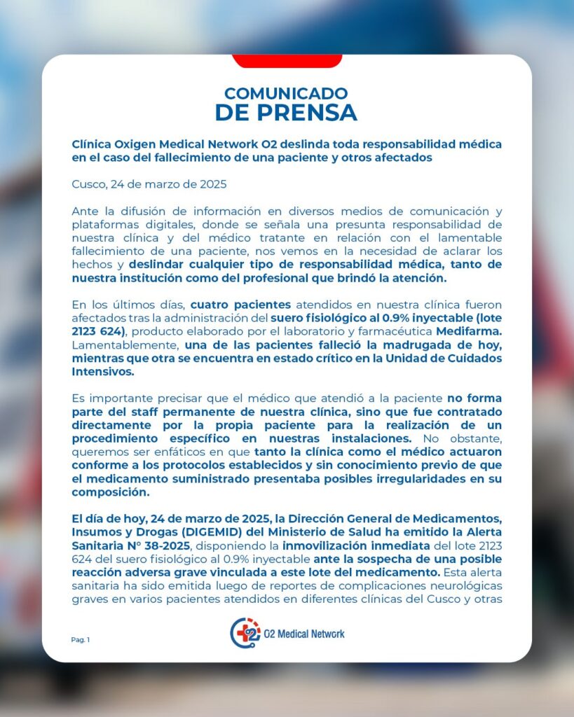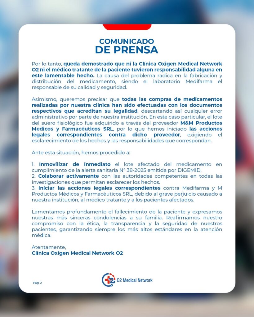 Además, la clínicas afirmó emprender acciones legales contra el laboratorio Medifarma y los proveeedores M&M Productos Médicos y Farmacéuticos SRL.