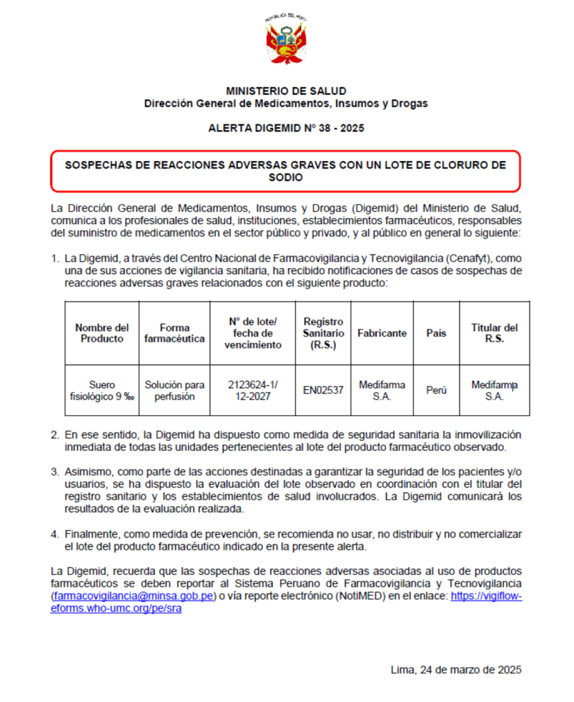 En respuesta a la situación, la clínica afirma haber inmovilizado el lote de suero implicado, colaborar con las autoridades y emprender acciones legales contra los proveedores. DIGEMID emitió una alerta sanitaria ordenando la inmovilización del lote sospechoso, tras reportes de complicaciones neurológicas en pacientes de varias clínicas del Cusco.